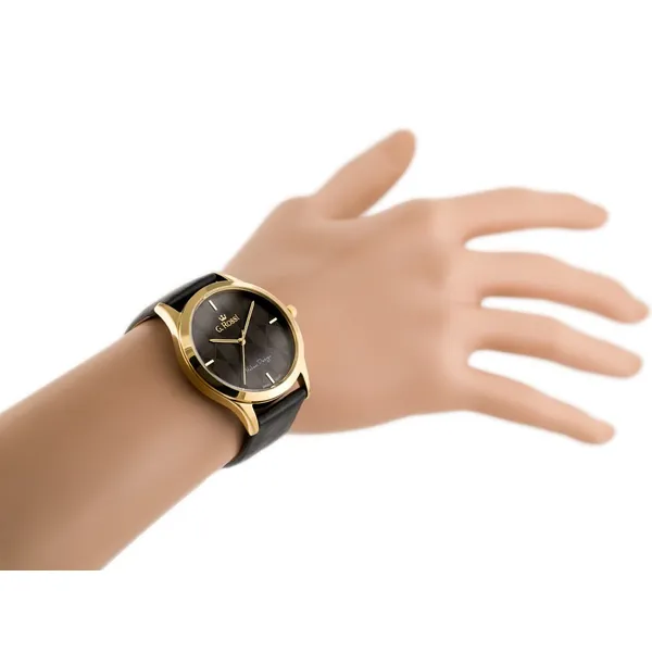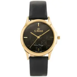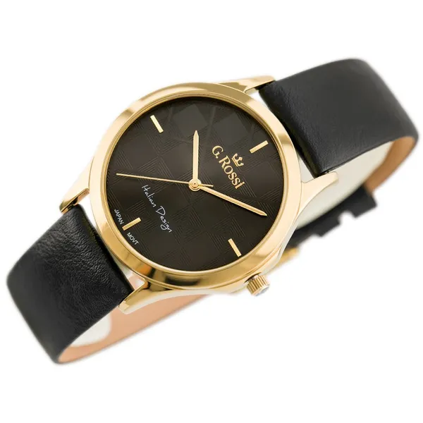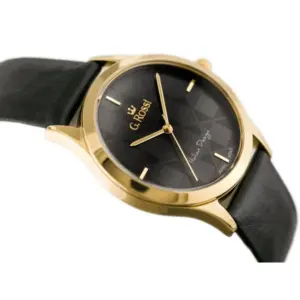 A G. Rossi 10513A-1A2 női karóra elegáns választás mindennapi viseletre és alkalmi megjelenéshez is. A fekete természetes bőrszíj, az aranyszínű tok és a fekete számlap harmonikus, nőies összhatást teremt. Az aranyszínű indexek kifinomult és időtálló megjelenést adnak, így ez a modell könnyen illeszkedik klasszikus és modernebb öltözékekhez egyaránt.