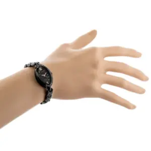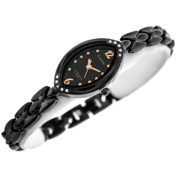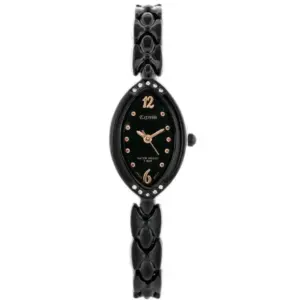 Elegáns, karcsú kialakítású női karóra fekete színben, amely kifinomult megjelenést ad hétköznapokra és alkalmi viselethez is. Az ovális tok és a fekete számlap modern, letisztult hatást kelt, míg a rózsaarany színű indexek finom kontrasztot biztosítanak.