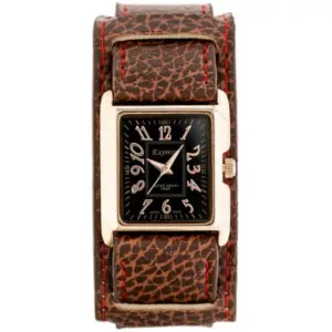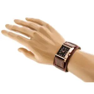 Elegáns női karóra modern, téglalap alakú tokkal és karakteres megjelenéssel. A fekete számlap, a rózsaarany színű tok és a barna pánt piros díszvarrással stílusos választás a mindennapokra és alkalmi viselethez is.