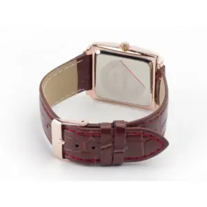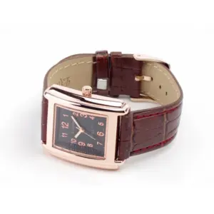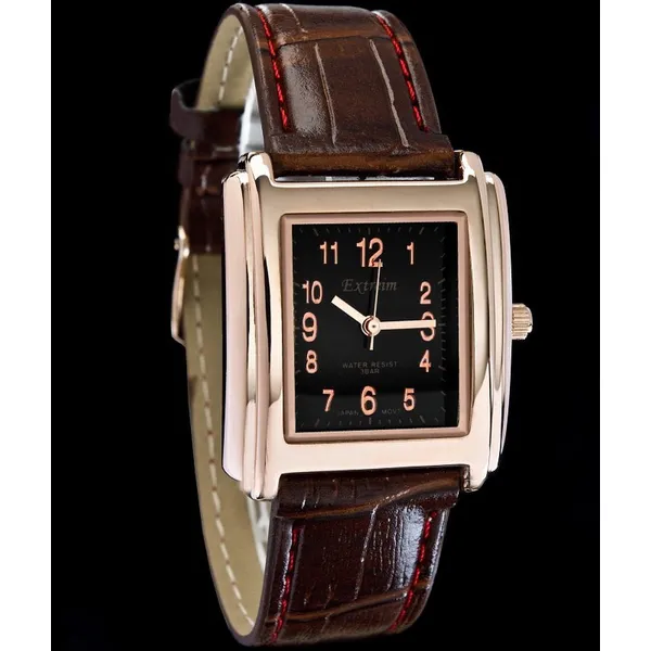 Elegáns, hétköznapi viselethez is jól illő női kvarc karóra fekete számlappal és barna textil szíjjal, piros díszvarrással. A rézszínű tok és a téglalap alakú kialakítás különleges, mégis könnyen kombinálható megjelenést ad.