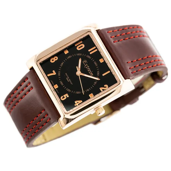Az Extreim női karóra a kedvelt G. Rossi almárkája, amely divatos megjelenést és megbízható működést kínál a mindennapokra. A japán Miyota kvarc szerkezet pontos időmérést biztosít, míg a fekete számlap, a rózsaarany színű tok és a barna textilszíj piros díszvarrással igazán karakteres összhatást teremt.