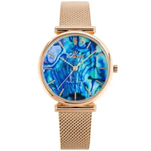 Elegáns női kvarc karóra különleges kék-türkiz textúrájú számlappal és rozé arany színű fém szíjjal. A japán Miyota szerkezet megbízható működést biztosít, míg az antiallergén IPR bevonat fokozott tartósságot és kényelmes viseletet nyújt a mindennapokban.