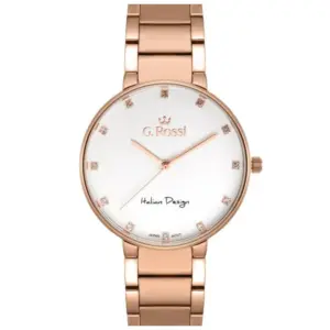 • Ezüst színű számlap, rózsaarany színű mutatókkal