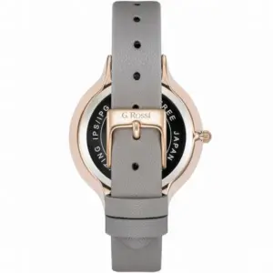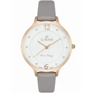 A G. Rossi női karóra elegáns és praktikus választás a mindennapokra. A szürke természetes bőrszíj, a rózsaarany színű tok és a fehér számlap harmonikus, nőies megjelenést alkot. A számlapon elhelyezett finom kristályos indexek diszkrét csillogást adnak, így ez a modell hétköznapi viselethez és alkalmi öltözékhez is remekül illik.