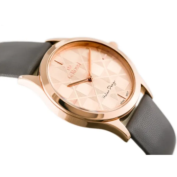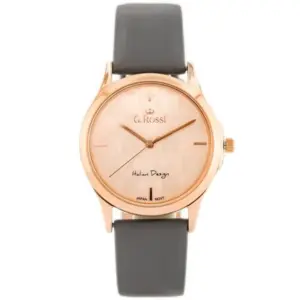 A G. Rossi női karóra elegáns választás a mindennapokra, amely finom nőies megjelenést ötvöz stílusos részletekkel. A szürke természetes bőrszíj, a rozéarany színű tok és a hozzá illő számlap harmonikus összhatást alkot, így az óra könnyen viselhető hétköznapi és alkalmi öltözékhez is.