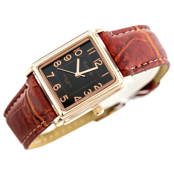 Az Extreim női karóra elegáns, karakteres megjelenést kínál a mindennapokra és alkalmi viselethez is. A téglalap alakú tok, a fekete számlap és a barna textilszíj harmonikus, nőies összhatást teremt.