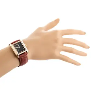 Elegáns, téglalap alakú női karóra fekete számlappal és barna textilszíjjal, amely könnyen kombinálható hétköznapi és alkalmi öltözékkel. A pontos Miyota kvarc szerkezet és az ásványi üveg megbízható, praktikus választássá teszi a mindennapokra.