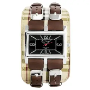 Elegáns, téglalap alakú női karóra fekete számlappal és barna szíjjal, amely könnyen kombinálható a mindennapi és alkalmi öltözékekkel. A japán Miyota kvarc szerkezet pontos működést, az ásványi üveg pedig megbízható védelmet nyújt a napi használat során.