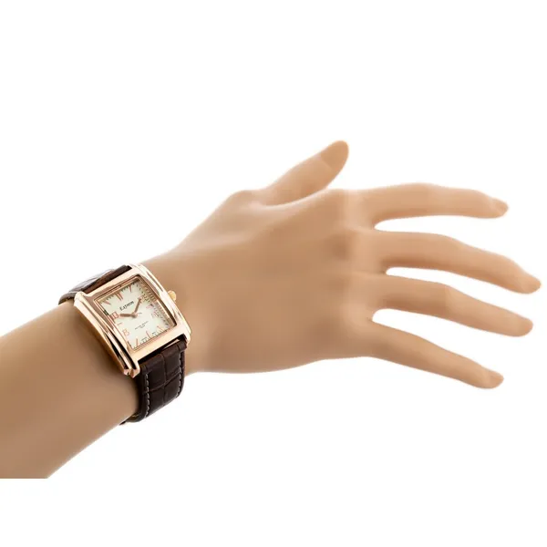 Elegáns, téglalap alakú női karóra japán Miyota kvarc szerkezettel, amely megbízható működést és kifinomult megjelenést nyújt a mindennapokban. Az ezüst számlap, a rózsaarany árnyalatú tok és a barna szíj stílusos, könnyen kombinálható választássá teszi.