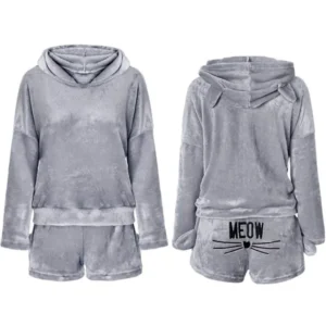 Puha plüss pamutból készült, kapucnis felsővel és rugalmas rövidnadrággal ellátott pizsama szett, amely melegen tart, mégis szellős viselet a pihentető éjszakákhoz.