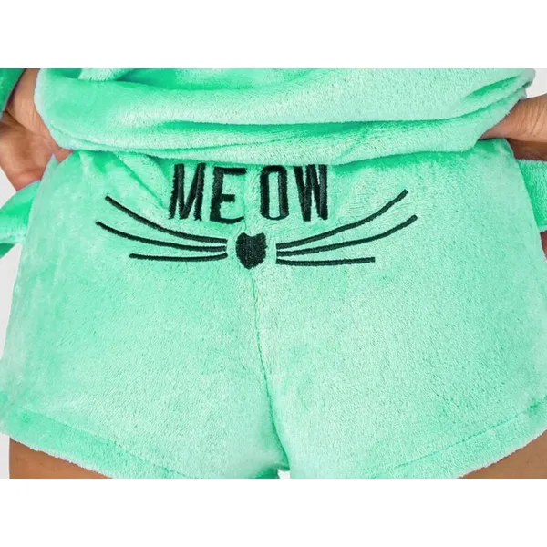 Puha plüss anyagával és meleg kapucnijával ez a kétrészes pizsama szett kényelmes alvást és otthoni pihenést nyújt, míg a rövidnadrág szabad mozgást biztosít a lábaknak.