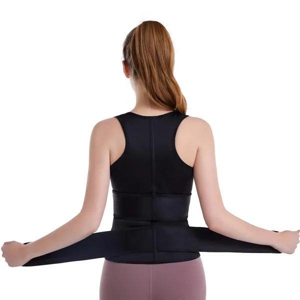 A neopren anyagból készült, szauna hatású női fitness mellény segíti a hatékony zsírégetést és a gyorsabb kalóriafelhasználást edzés közben. A rugalmas anyag kényelmes viseletet biztosít, miközben támogatja a helyes testtartást és formálja a derekat.