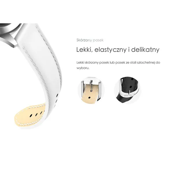 Ez a női okosóra elegáns megjelenést és hasznos mindennapi funkciókat kínál egy készülékben. A fehér szíj és a rózsaarany színű tok kifinomult, nőies stílust ad, így nemcsak praktikus eszköz, hanem divatos kiegészítő is.