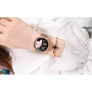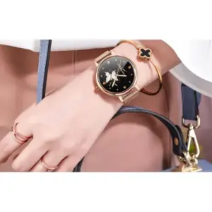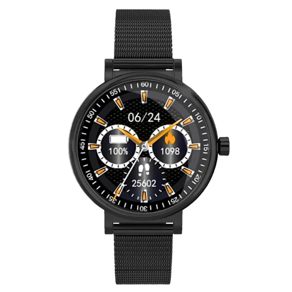Ez a női okosóra elegáns, fekete megjelenést kínál teljesen kerek kijelzővel és strapabíró acél szíjjal. A 1,09 hüvelykes TFT IPS kijelző éles, 240×240 pixeles felbontást biztosít, így a számlapok és értesítések jól láthatók a mindennapi használat során.