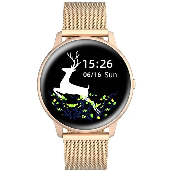 Elegáns, női kivitelű okosóra rózsaarany színben, amely stílusos megjelenést és praktikus funkciókat kínál a mindennapokra. A 1,28 hüvelykes, teljes érintőkijelzős HD TFT kijelző éles képet biztosít, a Bluetooth 5.0 kapcsolat pedig stabil és energiatakarékos működést nyújt.