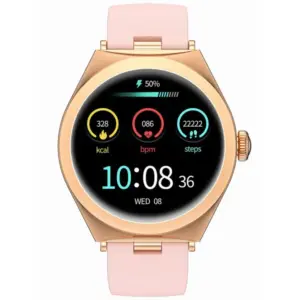 Ez a női okosóra elegáns, rózsaarany színű fémötvözet tokkal és pink gumiszíjjal készült, így stílusos választás a mindennapokra és az aktív életmódhoz is. A 1,27 hüvelykes TFT érintőkijelző 360 x 360 pixeles felbontással tiszta, jól olvasható megjelenítést biztosít.