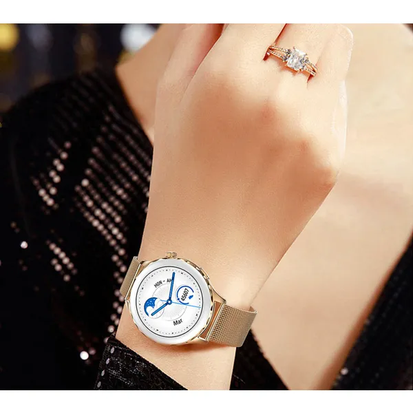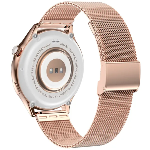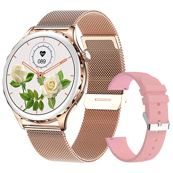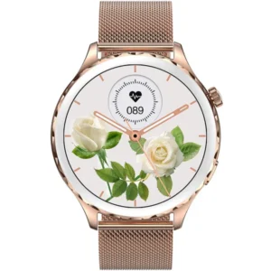 Elegáns rózsaarany fémházas női okosóra 1,32”-es, nagy felbontású IPS kijelzővel, beépített kihangosított hívásfunkcióval és cserélhető szíjjal. Mérd pulzusodat, vérnyomásodat és lépéseidet, kapj valós idejű értesítéseket, és élvezd a napokig tartó üzemidőt egyetlen töltéssel.