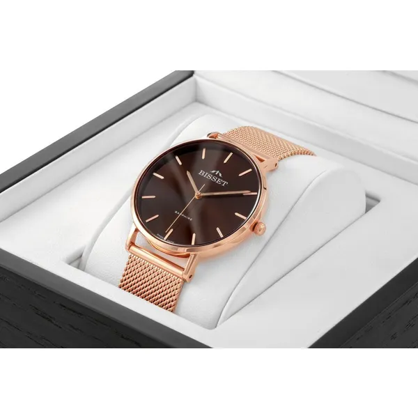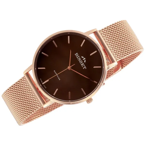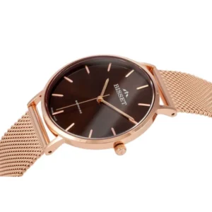 A BISSET BSBF33 női karóra elegáns kiegészítő, amely svájci Ronda EOL kvarc​mechanizmussal működik, így mindig pontos időt mutat. A rozsdamentes acél tok és mesh-jellegű braszoletta tartós, antiallergén bevonattal ellátott rozéarany árnyalatot kapott, amely harmonikusan illik a barna számlaphoz. A karcálló zafírüveg hosszú távon is megőrzi kristálytiszta fényét, míg a 30 m-es vízállóság a mindennapi fröccsenő víz ellen nyújt védelmet.