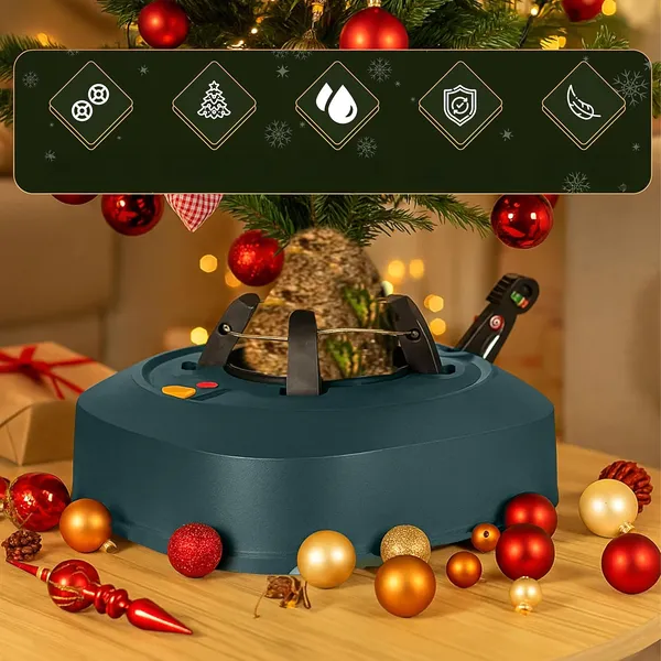 Az önzáró, pedálos karácsonyfaállvány gondoskodik róla, hogy a fenyő biztonságosan és egyenes álljon az ünnepi időszak teljes ideje alatt. A 3–13 cm vastag törzsű fák gyorsan, hajolgatás nélkül rögzíthetők, a 2,3 literes víztartály pedig folyamatos nedvességet biztosít, így a tűlevelek tovább maradnak zöldek.