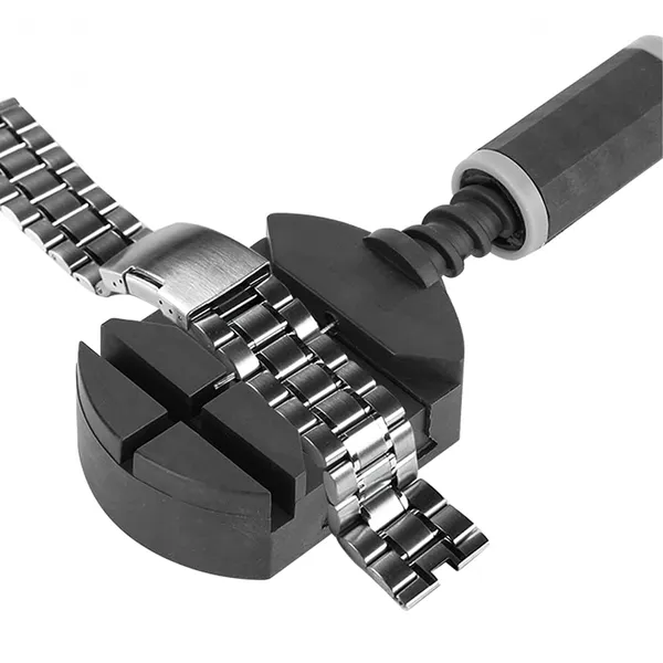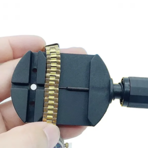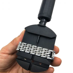 A professzionális óraszervizek és lelkes hobbiórások nélkülözhetetlen kelléke ez a robosztus óraszíj szem eltávolító és rövidítő szerszám. Segítségével néhány mozdulattal ki- vagy beüt­heti a szeg­eket, így pontosan illesztheti a fém karkötőt a csuklóra, sérülés vagy karcolás kockázata nélkül.