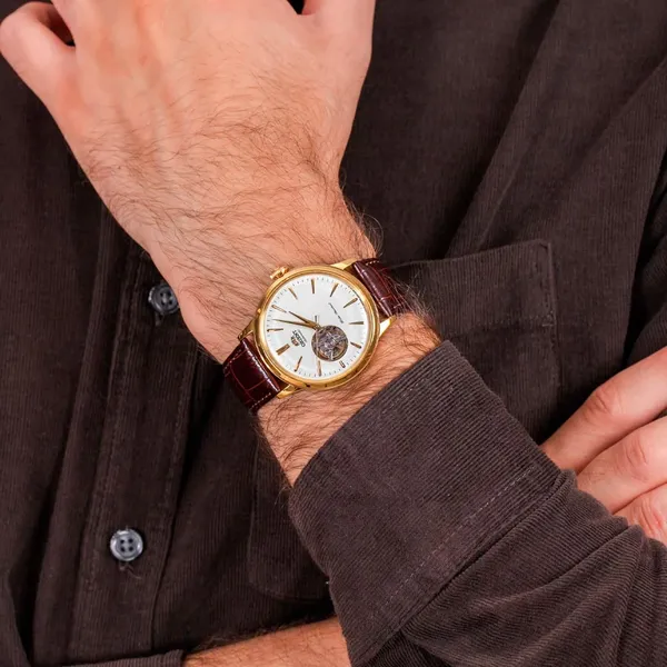 Az Orient Classic Bambino Open Heart RA-AG0003S10B elegáns, mégis praktikus választás mindennapi viselethez és alkalmi megjelenéshez is. A letisztult, fehér számlapot az „open heart” kivágás teszi különlegessé, amely betekintést enged az automata szerkezet működésébe. A számlapot domború ásványi üveg védi, a klasszikus arany tónusú tok és a barna bőrszíj pedig prémium, időtálló összhatást ad.