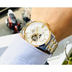 Az Orient Classic Sun & Moon RA-AS0007S10B egy elegáns, mégis praktikus automata férfi karóra, amely tökéletes választás mindennapi viselethez és alkalmi megjelenéshez is. A letisztult, arany színű számlapot domború ásványüveg védi, míg a rozsdamentes acél tok és fémcsat prémium, időtálló érzetet ad.
