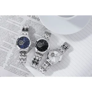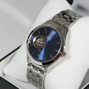 Az Orient Contemporary Open Heart FAG03001D0 egy elegáns, mégis mindennap hordható férfi automata karóra, amely a klasszikus stílust modern részletekkel ötvözi. A kék open heart számlap látványosan enged betekintést a szerkezet működésébe, miközben a rozsdamentes acél tok és csat prémium, időtálló megjelenést biztosít.
