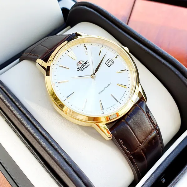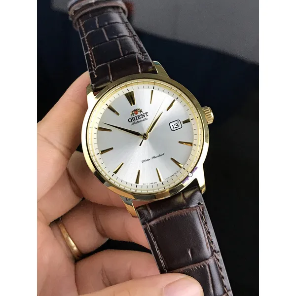 Orient Contemporary Symphony III férfi automata óra, ezüst számlap, barna bőrszíj, arany tok, WR50, dobozzal