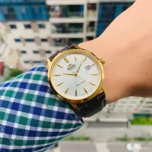 Elegáns, mégis strapabíró automata férfi karóra japán szerkezettel és jól olvasható ezüst számlappal, amelyet domború ásványi üveg véd. A barna bőrszíj és az aranyszínű acél tok klasszikus megjelenést ad, a dátumkijelzés és a WR50 vízállóság pedig kényelmessé teszi a mindennapokban.