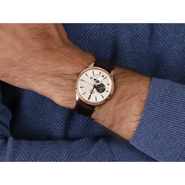 Az Orient Contemporary Sun & Moon RA-AS0102S10B egy prémium megjelenésű, mégis mindennap hordható férfi automata karóra. A letisztult, fehér számlapot domború ásványüveg védi, a rose gold tónusú tok és a barna bőrszíj pedig elegáns, időtálló összhatást ad. Különlegessége a Sun & Moon kijelzés, amely stílusos módon teszi egyedivé a számlapot.