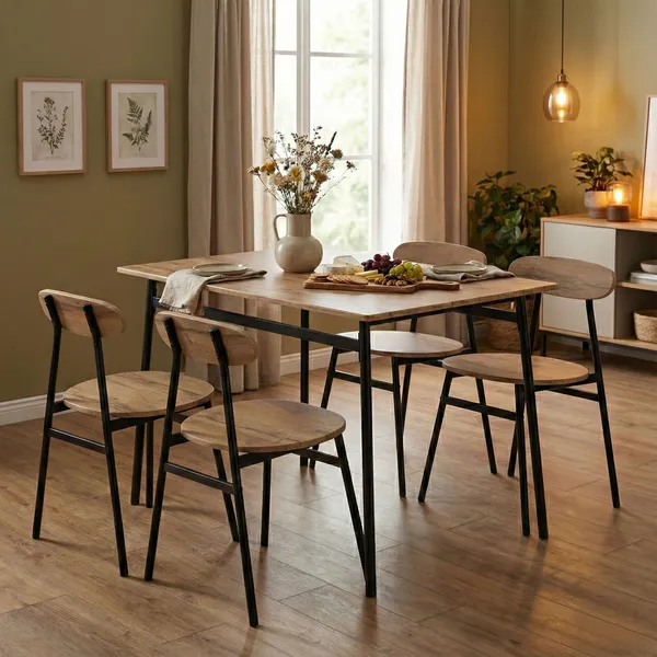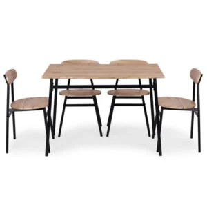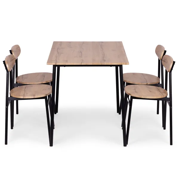 Loft stílusú étkezőszett asztallal és 4 székkel, amely kis alapterületű konyhában vagy étkezőben is kényelmesen elfér. A könnyen tisztítható MDF felületek és a stabil acél váz a mindennapi használatban is tartós, a lábvédők pedig segítenek óvni a padlót.