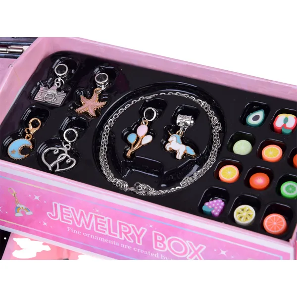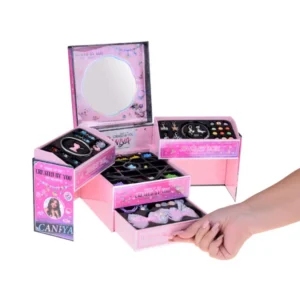 A háromszintes, összecsukható ékszerdobozban minden megtalálható, amire egy kis divattervezőnek szüksége van: tükrös fedél a próbához, színes gyöngyök és medálok, rugalmas zsinór, valamint látványos hajba valók. A doboz kinyitva átláthatóan rendezi az alkatrészeket, majd egy mozdulattal kompakt kockává zárható, így könnyű tárolni és magaddal vinni.
