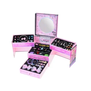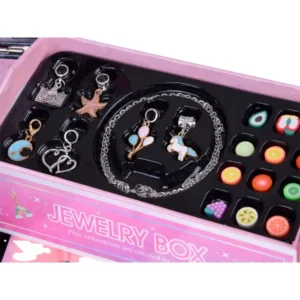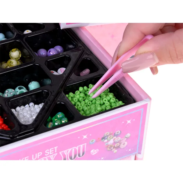 Összecsukható, háromszintes ékszerdoboz színes gyöngykészlettel és hajdíszekkel, amely játékosan fejleszti a kézügyességet és a fantáziát. Kompakt mérete miatt bárhová magaddal viheted, hogy bármikor alkothass egyedi kiegészítőket.