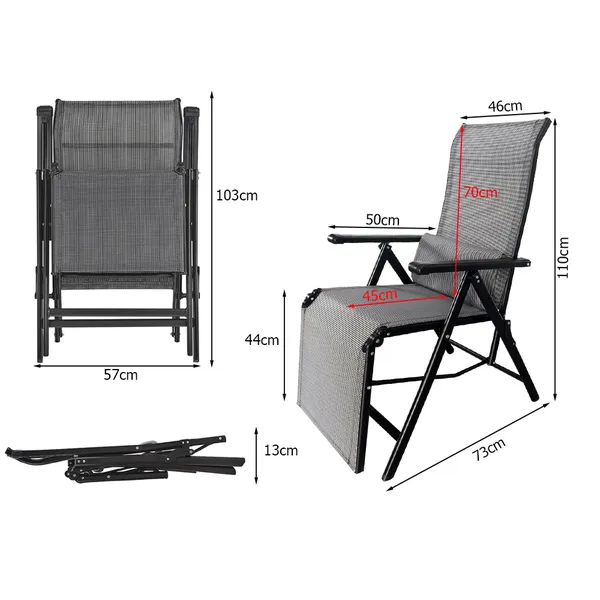 Állítható háttámlájával könnyen megtalálja a legkényelmesebb pihenőpozíciót kertben, strandon vagy kempingben. Stabil acélváza biztonságot ad, a légáteresztő szövet melegben is komfortos, összecsukható kialakítása pedig egyszerű szállítást és helytakarékos tárolást biztosít.