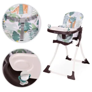 Stabil, összecsukható etetőszék, amely megkönnyíti a közös étkezéseket és helytakarékosan tárolható. Az állítható tálca és lábtartó kényelmes üléspozíciót ad, a 3 pontos biztonsági öv és a középső gát pedig segít, hogy a kicsi biztonságban maradjon; a tálcán lévő játékok lekötik a figyelmét.