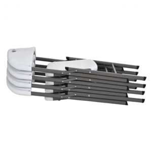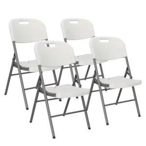 Négy darab, fehér összecsukható szék egy szettben, amely gyorsan elővehető és kis helyen tárolható. Praktikus választás rendezvényekre, kertbe vagy piknikhez, ha megbízható extra ülőhelyekre van szükséged.