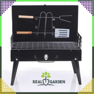 Összecsukható hordozható faszén grillsütő bőrönd 44×27×47 cm fekete, eszközökkel