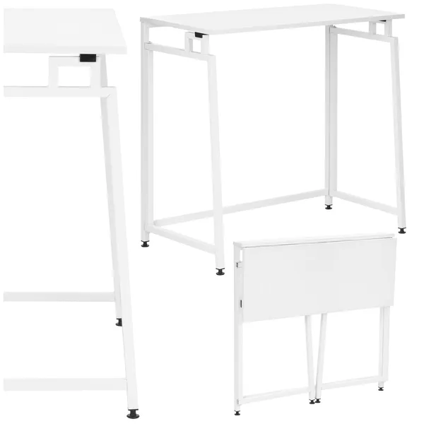 Helytakarékos, összecsukható íróasztal fehér fa‑fém kivitelben, amely gyorsan felállítható és használat után könnyen elpakolható. Stabil, porszórt vázzal és állítható szintezőlábakkal segít kényelmes, rendezett munkasarkot kialakítani kisebb terekben is.