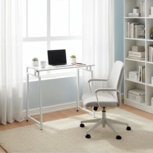 Praktikus, helytakarékos összecsukható íróasztal, amely ideális home office-hoz, tanuláshoz vagy kisebb lakásokba. A fehér asztallap és a fém váz letisztult megjelenést ad, az összecsukható kialakítás pedig könnyű tárolást tesz lehetővé.