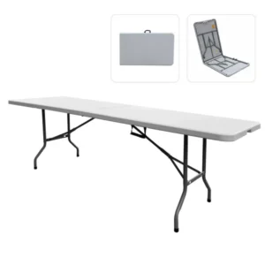 Akár kerti partihoz, céges rendezvényhez vagy hosszú kemping túrához keresel strapabíró, nagy méretű asztalt, ez a 240×74×74 cm-es modell ideális választás. A masszív, porfestett fémváz és a nagy sűrűségű HDPE műanyag lap ellenáll az UV-sugárzásnak, az esőnek és könnyen tisztítható. Összecsukva praktikus bőrönddé alakul, amit ergonomikus fogantyúval pillanatok alatt magaddal vihetsz.