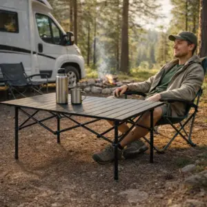 Összecsukható kempingasztal 95×55 cm – praktikus társ kempingezéshez, piknikhez és kerti grillezéshez. Könnyű, mégis stabil kialakítása gyorsan felállítható, így kényelmes felületet ad étkezéshez, snackek előkészítéséhez, italok és kempingkellékek elhelyezéséhez.