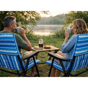 Összecsukható turista szék matraccal – ideális választás strandra, kertbe, kempingezéshez vagy horgászathoz. Könnyű kialakításának és kompakt méretének köszönhetően egyszerűen magaddal viheted a sátorhoz, a tópartra vagy egy családi grillezésre. A nyárias, csíkos megjelenés remekül illik a vakáció hangulatához.