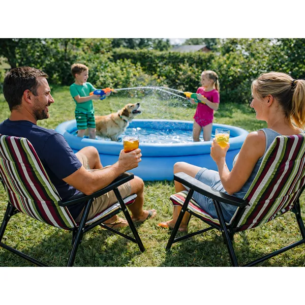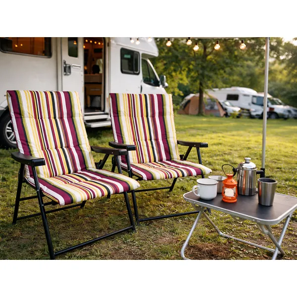 Összecsukható, könnyű kempingszék párnázott üléssel – ideális választás strandra, kertbe, horgászathoz, piknikre, fesztiválra vagy kempingezéshez. Kompakt kialakításának köszönhetően egyszerűen magaddal viheted a tópartra, a sátorhoz vagy a hétvégi telekre, a csíkos minta pedig igazi nyári hangulatot ad.