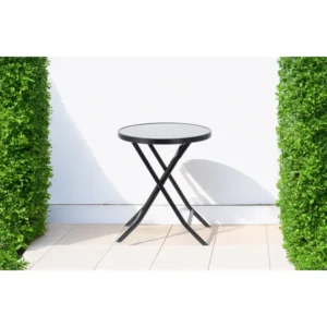 Az összecsukható, fekete kerek asztal praktikus megoldás erkélyre, teraszra vagy akár beltéri használatra. A 60 cm-es edzett üveglap elegáns megjelenést és könnyű tisztíthatóságot kínál, a porszórt acél váz pedig stabil tartást biztosít. Összecsukva minimális helyet foglal, így szezonon kívül vagy költözéskor egyszerű a tárolása.