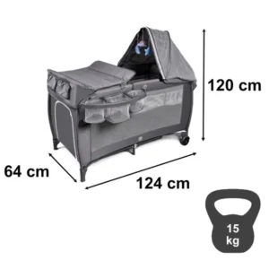 Összecsukható kétszintű utazó babaágy pelenkázóval, 15 kg-ig, szürke