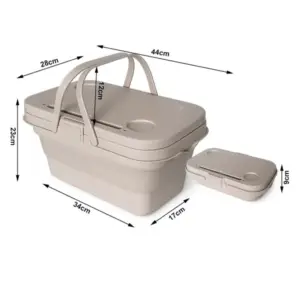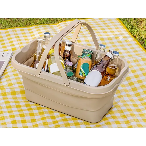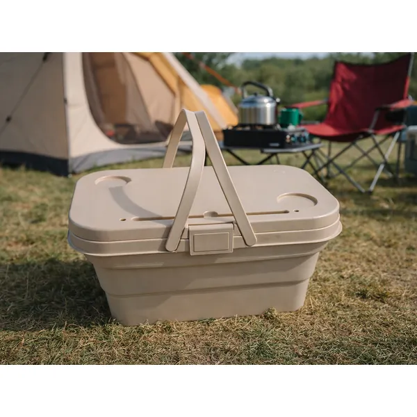 Összecsukható szilikon piknikkosár fedéllel – asztal és vízálló tároló, 14 l, bézs