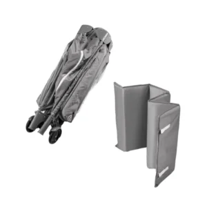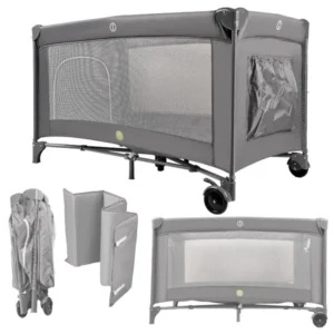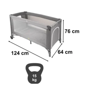 Könnyű, összecsukható utazó babaágy 60×120 cm fekvőfelülettel, rögzíthető matraccal és hálós oldalakkal, hogy a kicsi biztonságban és kényelmesen aludhasson bárhol. A cipzáros bejárat, a fékezhető kerekek és a hordtáska egyszerűvé teszi az utazást a szülők számára.