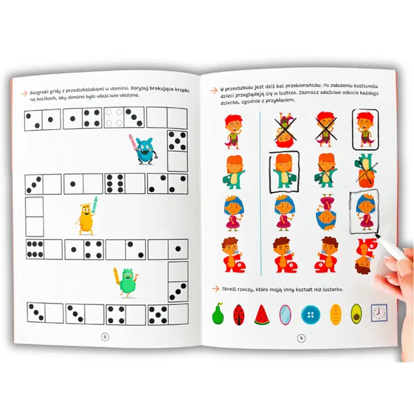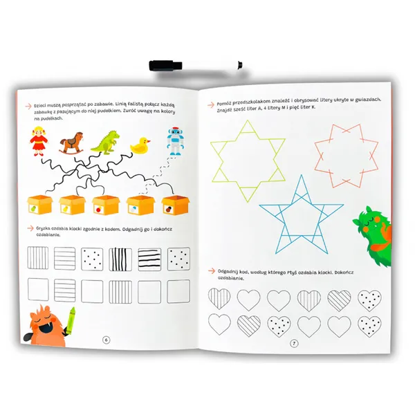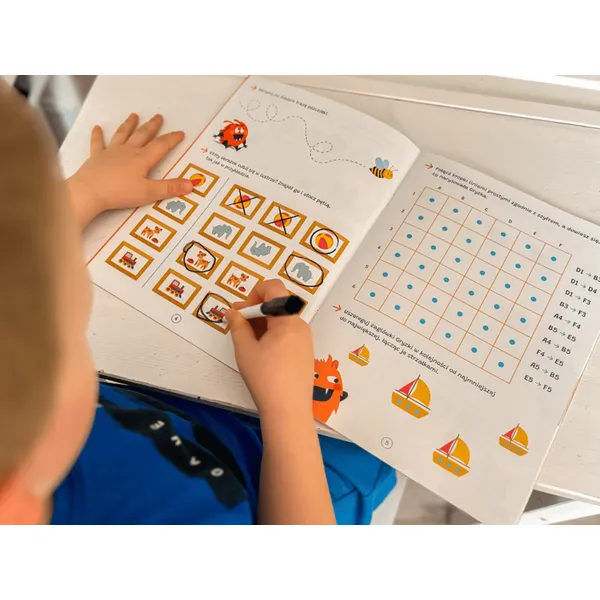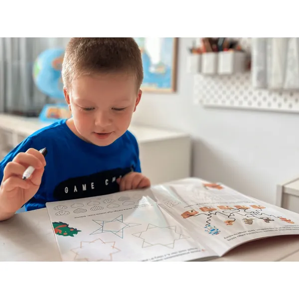 Vidám óvodás foglalkoztató, amely logikai feladatokkal, keresős játékokkal és grafomotoros gyakorlatokkal fejleszti a figyelmet és a gondolkodást. A törölhető filcnek köszönhetően a gyerek újra meg újra megoldhatja a feladatokat, így hosszabb ideig leköti.