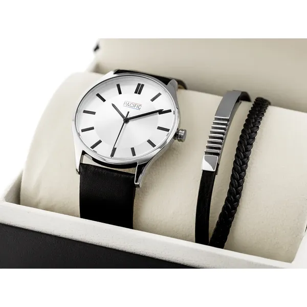 Pacific férfi kvarc karóra ajándékszett, ezüst számlap, fekete bőrszíj