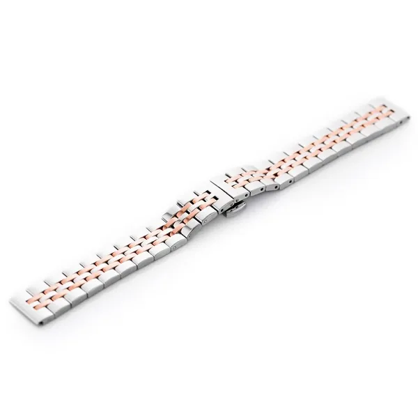 Elegáns, rozsdamentes acél óraszíj pillangócsattal, ezüst és rozéarany színkombinációban. Kiváló választás prémium megjelenésű karórákhoz, ha tartós és igényes kivitelű fém szíjat keres.